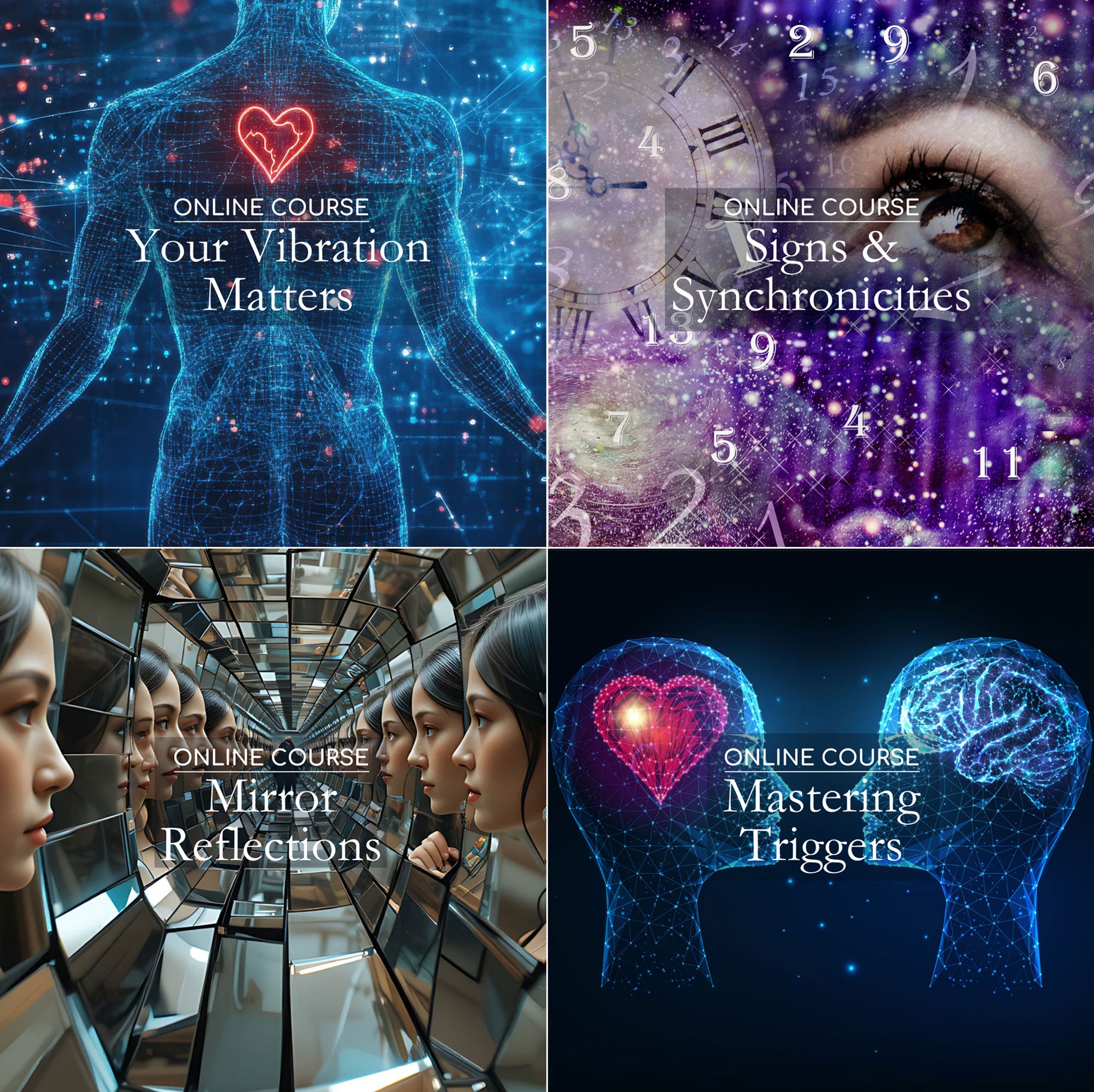 Click on each individual Live Course Link to see what Modules are included in each course. Your Vibration Matters, Signs and Synchronicities, Mirror Reflections and Mastering Triggers